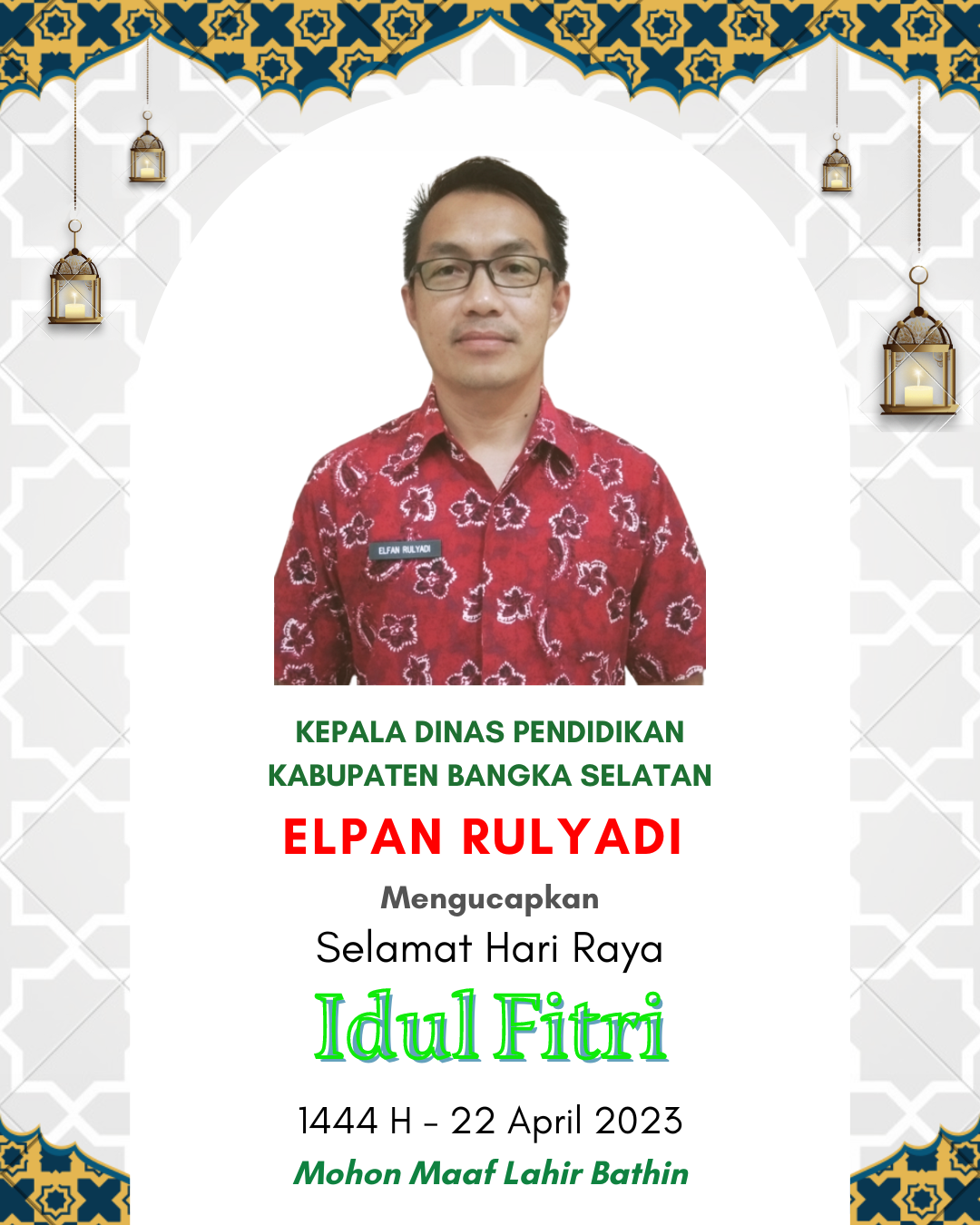 Kepala Dinas Pendidikan Kabupaten Bangka Selatan Mengucapkan Selamat Hari Raya Idul Fitri 1444 HApril 20, 2023April 22, 2023oleh adminoleh adminJangan LewatkanKepala dinas Perumahan,Pemukiman Dan Perhubungan Kabupaten Bangka Tengah,Mengucapkan Selamat Hari Raya Idul Fitri 1446 H/2025 Mohon Maaf Lahir Dan BathinKepala Sekolah & Staf Pegawai Serta Keluarga Besar SMPN 04 Simpang Katis Mengucapkan Selamat Hari Raya Idul Fitri 1445 H/ 2024 M Mohon Maaf Lahir Dan BathinKepala Dinas Perpustakaan dan Kearsipan Kabupaten Bangka Selatan Mengucapkan Selamat Hari Raya Idul Fitri 1445 H/ 2024 M Mohon Maaf Lahir Dan BathinKepala Dan Seluruh Staf Pegawai Dinas Pendidikan Prov. Kep. Babel Mengucapkan Selamat Hari Raya Idul Fitri 1445 H/ 2024 M Mohon Maaf Lahir Dan BathinKepala Dinas Pendidikan Kabupaten Bangka Tengah Mengucapkan Selamat Hari Raya Idul Fitri 1445 H/ 2024 M Mohon Maaf Lahir Dan Bathin