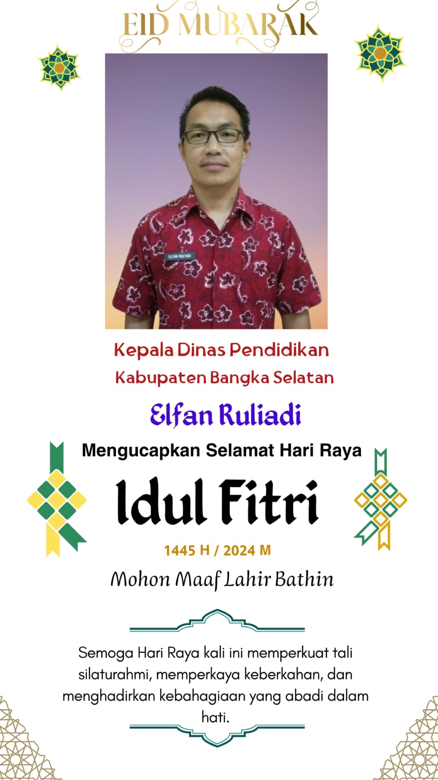 Kepala Dinas Pendidikan Kabupaten Bangka Selatan Mengucapkan Selamat Hari Raya Idul Fitri 1445 H/ 2024 M Mohon Maaf Lahir Dan Bathin