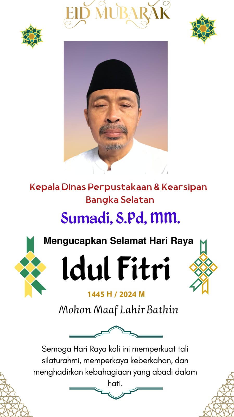 Kepala Dinas Perpustakaan dan Kearsipan Kabupaten Bangka Selatan Mengucapkan Selamat Hari Raya Idul Fitri 1445 H/ 2024 M Mohon Maaf Lahir Dan Bathin