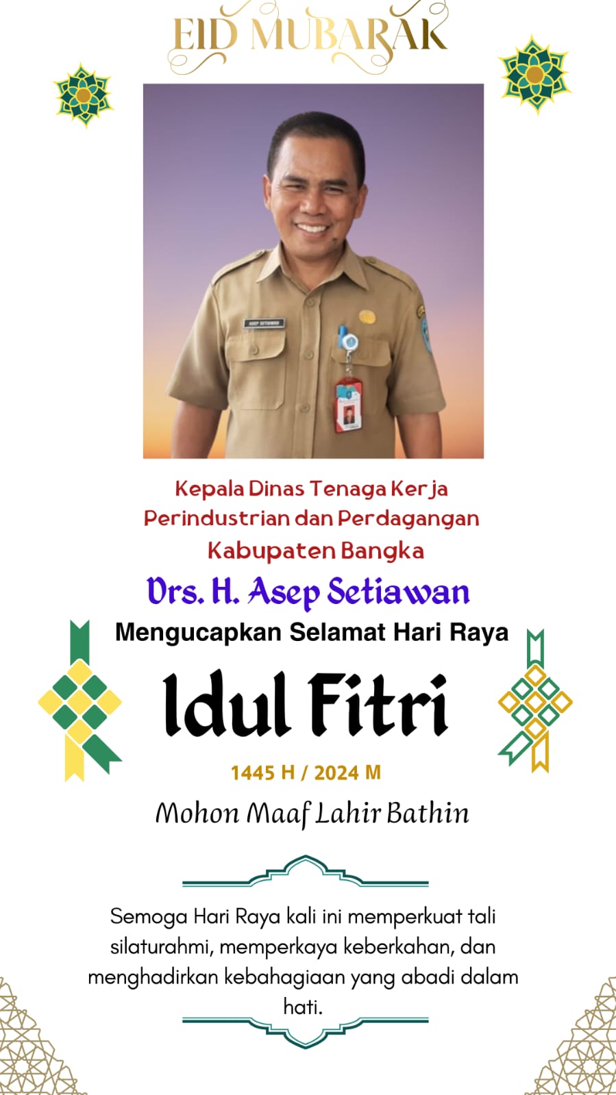 Kepala Dinas Tenaga Kerja Perindustrian dan Perdagangan Bangka Mengucapkan Selamat Hari Raya Idul Fitri 1445 H/ 2024 M Mohon Maaf Lahir Dan Bathin