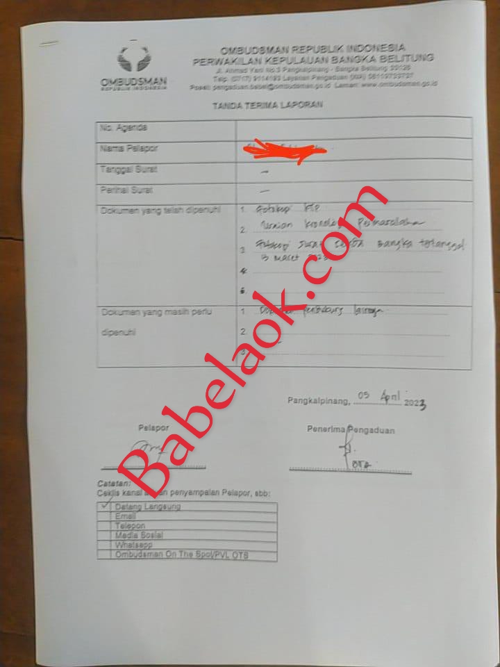 Photo : Bukti Tanda Terima pengaduan ke Ombudsman RI Perwakilan Prov. Kepada. Bangka Belitung