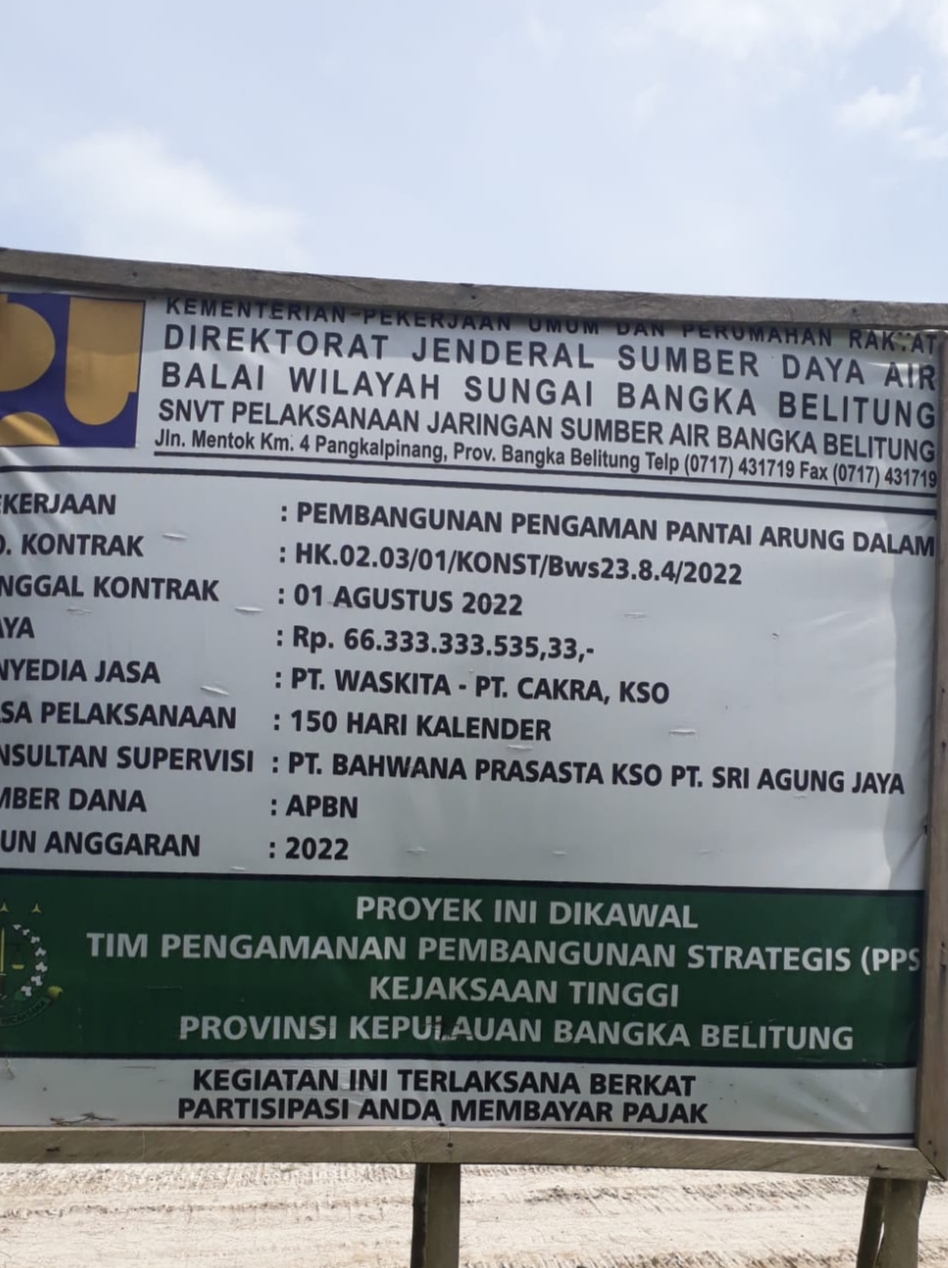 Pekerjaan Pembangunan Pengaman Pantai Arung Dalam yang terletak di Desa Arung Dalam Kecamatan Koba Kabupaten Bangka Tengah (Bateng) Provinsi Kepulauan Bangka Belitung (Babel) yang dikelola PPK Sungai dan Pantai pada Satuan Kerja Non Vertikal Tertentu (SNVT) Pelaksanaan Jaringan Sumber Air (PJSA) Provinsi Babel, Balai Wilayah Sungai (BWS) Provinsi Babel Direktorat Jenderal Sumber Daya Air (Ditjen SDA) Kementerian Pekerjaan Umum dan Perumahan Rakyat (PUPR) melalui penyedia jasa PT. Waskita – PT. Cakra, KSO sesuai kontrak No. HK.02.03/01/KONS/Bws23.8.4/2022 tanggal 01 Agustus 2022 dengan biaya sebesar Rp. 66.333.333.535.33 sumber dana APBN 2022 (SBSN) selesai dengan baik dan tepat waktu 150 hari kalender. Rabu, 05/01/2023